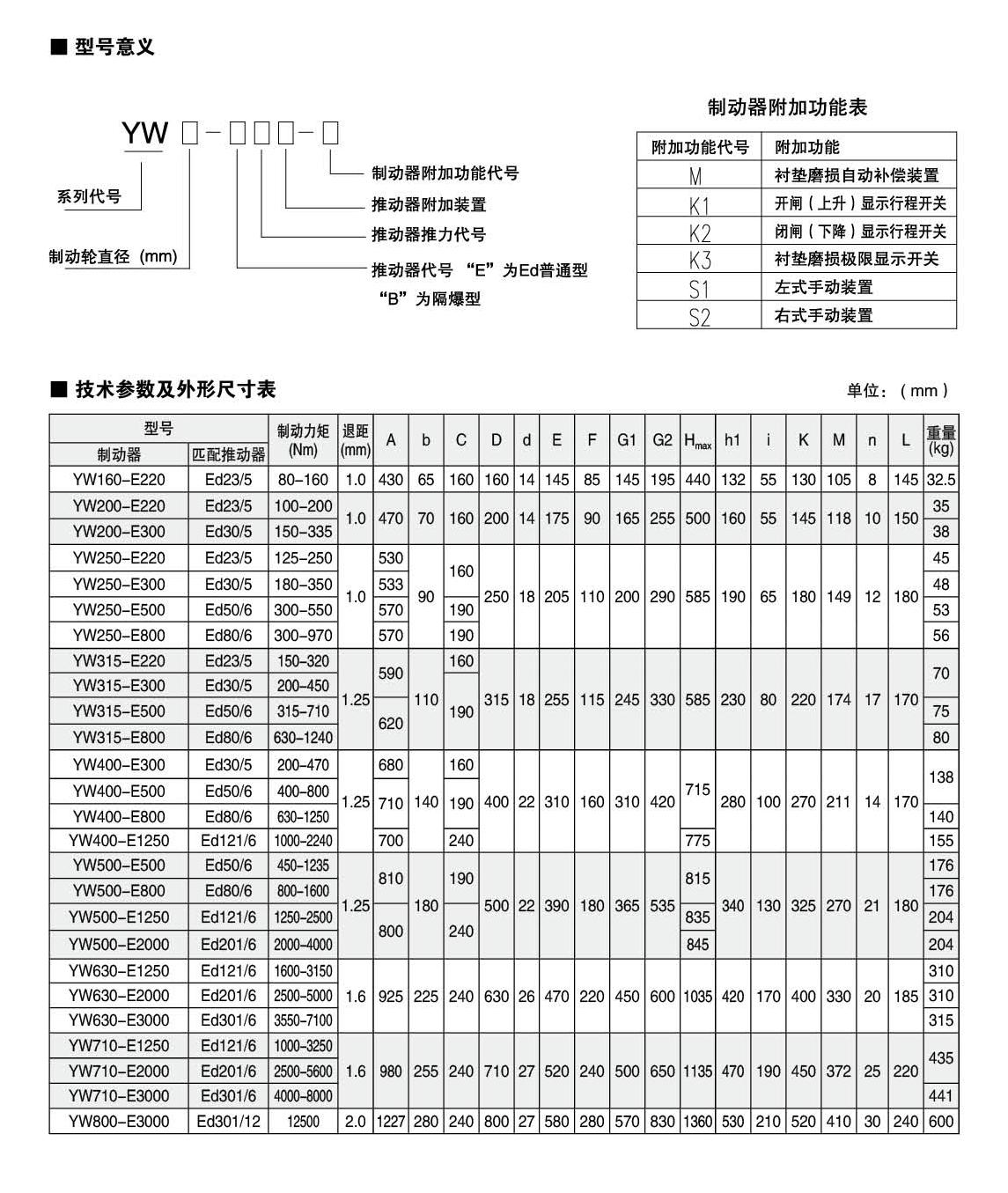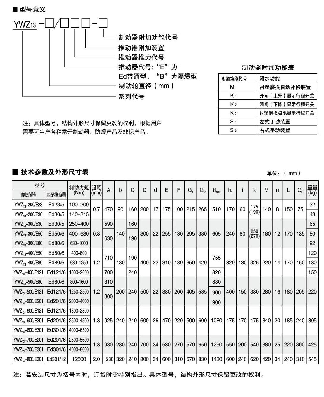 YW,YWZ13系列電力液壓鼓式制動器的連接尺寸和技術(shù)要求符合JB / T6406-2006標(biāo)準(zhǔn);制動力矩參數(shù)符合DIN15435標(biāo)準(zhǔn),配套符合DIN15430標(biāo)準(zhǔn)的Ed系列推動器。